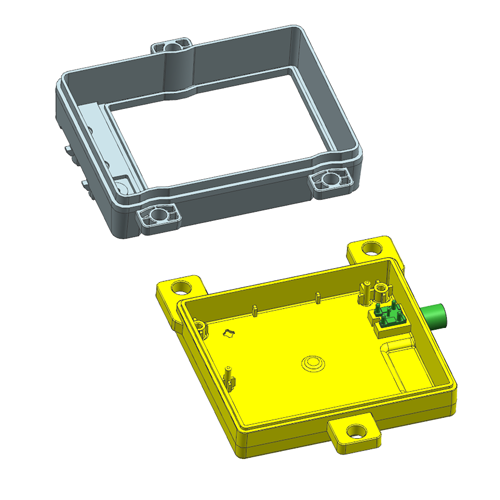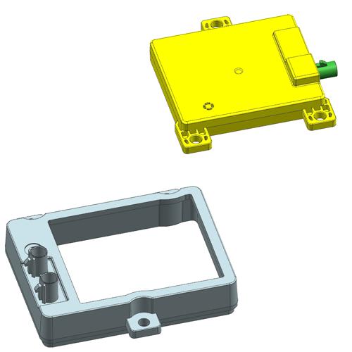 Exploded CAD of ECU housing cover and base, supporting insert molding DFM review for interface fit, assembly sealing surfaces, and tolerance targets.