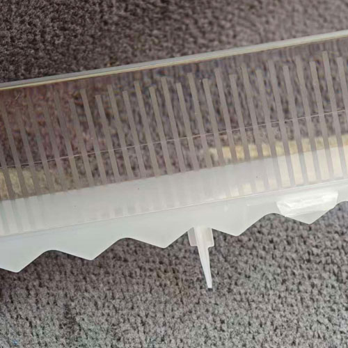 Close-up of prism/linear optical features on a 2K crystal light part, requiring sharp feature replication and high-polish tooling.